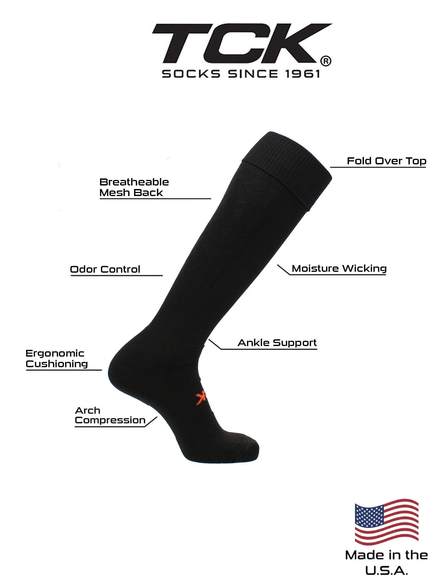 TCK Premier Soccer Socks are a must have for your next game, outing, or practice. Featuring moisture control yarns, breathable mesh, ergonomic cushion, arch compression, a fold down top, they provide maximum athletic performance. These socks are suitable for both boys and girls and come in youth and adult sizes. Founded in 1961, TCK socks are manufactured with pride in the USA.