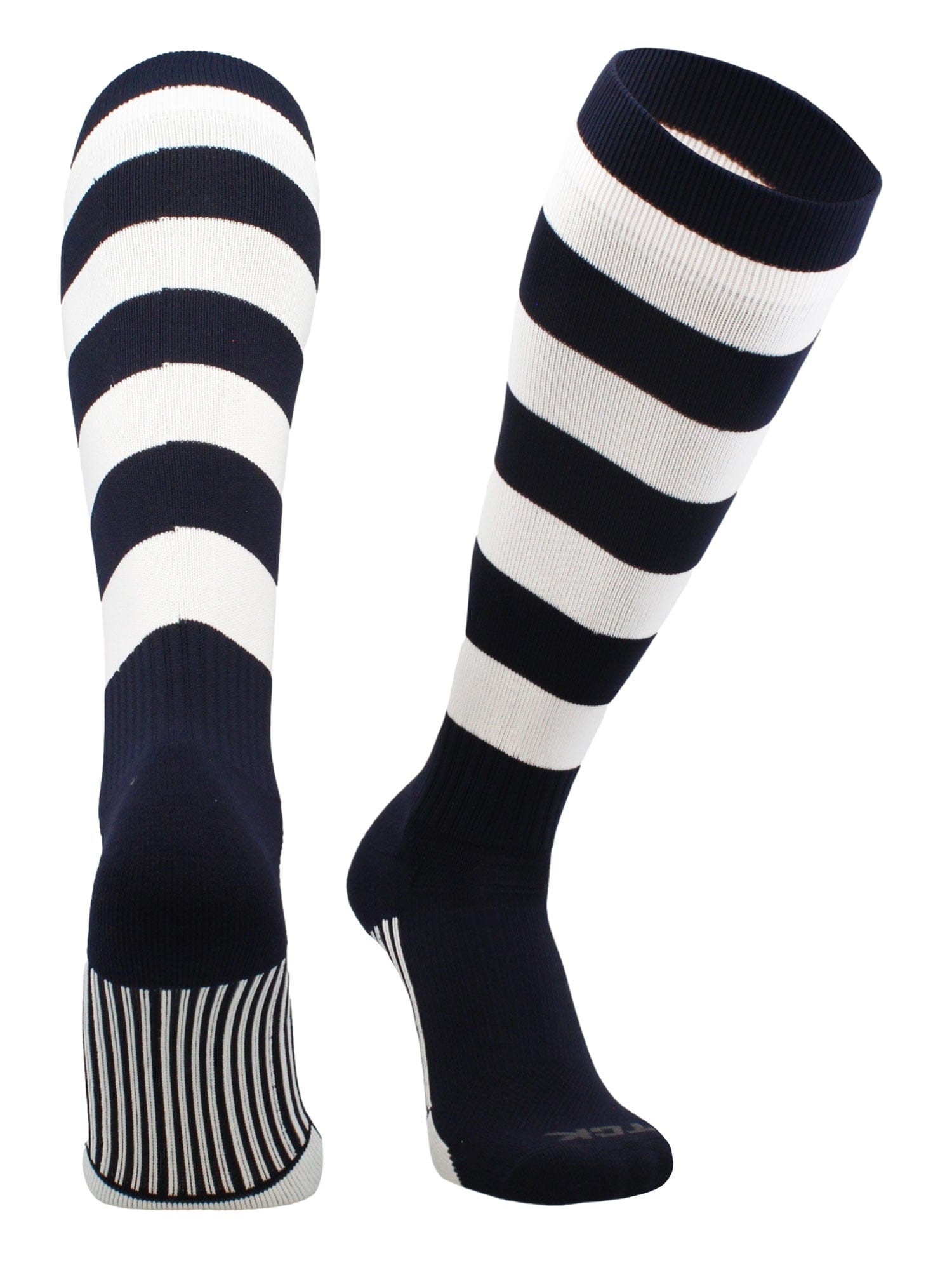 - UPDATED FOR PERFORMANCE: These hoop striped rugby socks and football socks were updated in Spring of 2024 with moisture wicking yarns and new performance enhancing features like arch compression and a padded heel and toe.