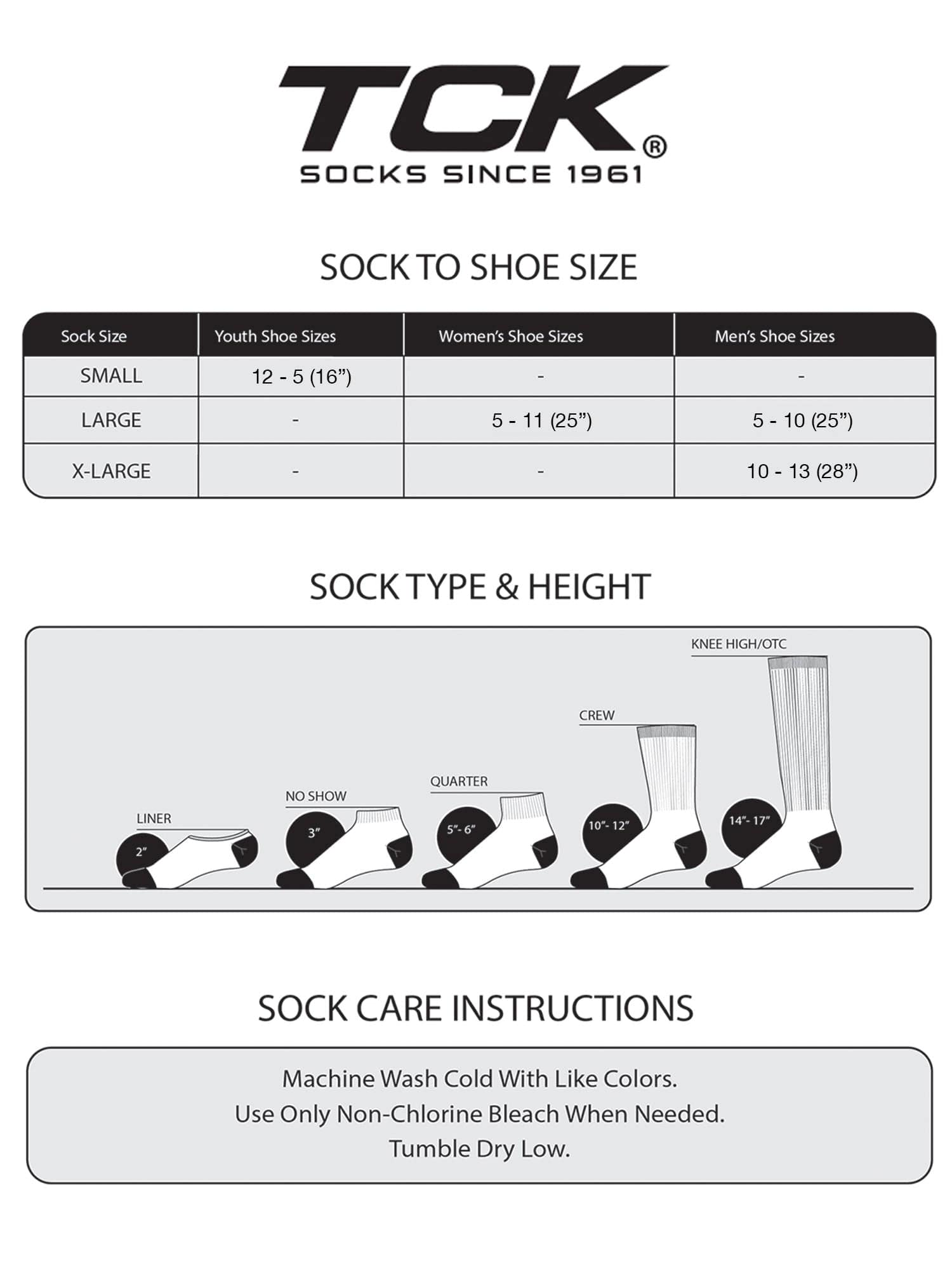 - ACCURATE SIZING: TCK Sock Size: Small - Youth Shoe Size 12-5 (16"), Large - Womens Shoe Size 5-11 Mens Shoe Size 5-10 (25"), X-Large Womens Shoe Size 11+ Mens Shoe Size 10+ (28")
