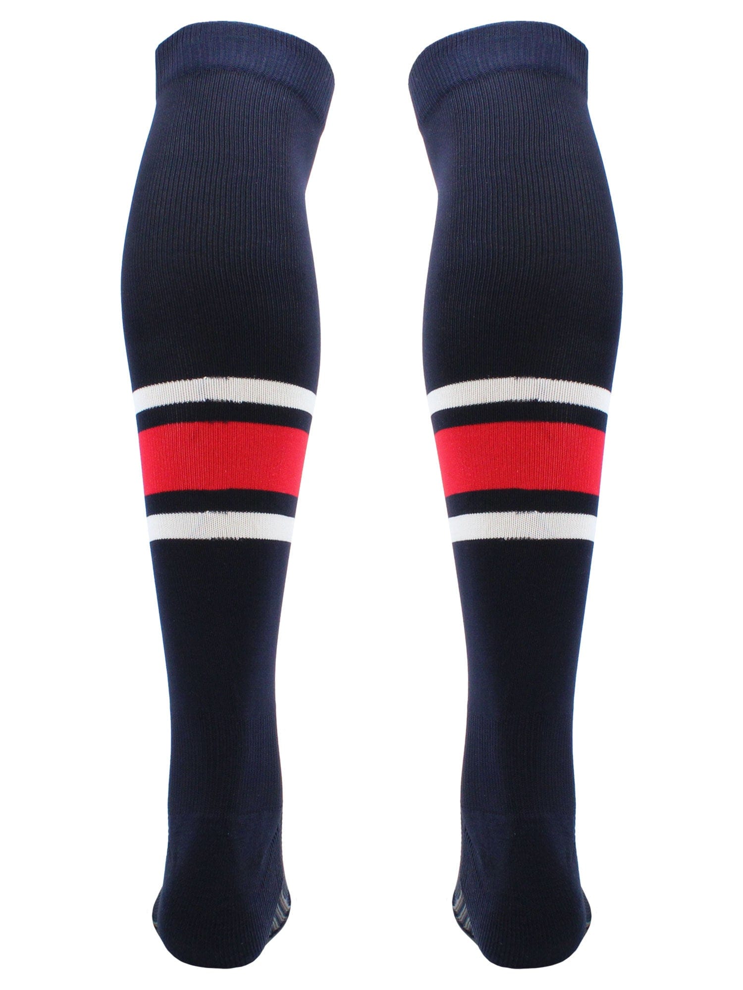 Dugout Striped Over the Knee Baseball Socks Pattern E - Navy/White/Scarlet / Large is backordered and will ship as soon as it is back in stock.