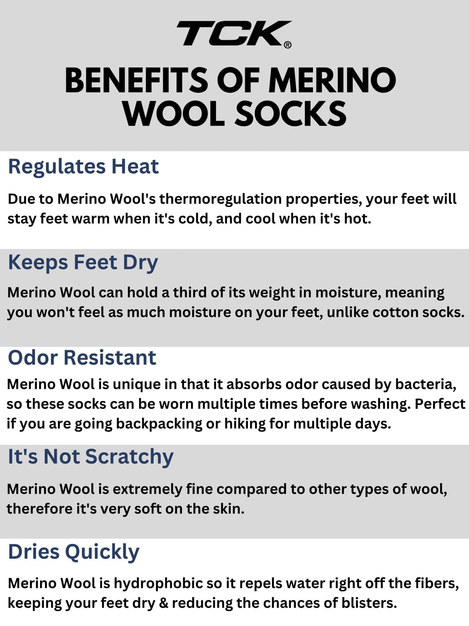 - COMFORTABLE MERINO WOOL SOCKS: Merino wool helps regulate heat, keeping you warm in the winter and cool in the summer. The perfect all weather sock! We use high quality yarns that naturally keep moisture away from skin, meaning less blisters. TCK socks are made with advanced yarns to help control odors. The wool fibers also dry quickly for multi-day use. Double welt ensures the sock stays up. This crew style sock hits just below the calf. We think these will be your favorite socks!